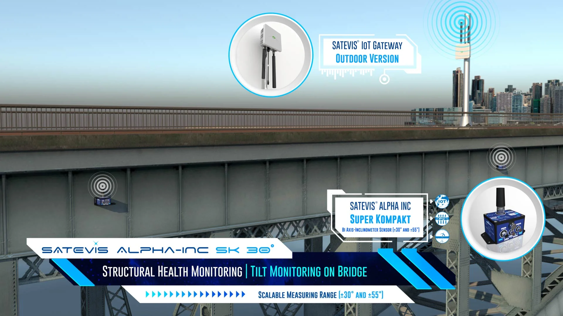 Satevis® Alpha Inc SK 30B (SK: Super Kompakt) is a high-precision wireless bi-axis inclinometer sensor (scalable range ±30° / ±55°) that integrates the open-standard LoRaWAN® protocol, making it ideal for Structural Health Monitoring (SHM), geotechnical applications, land surveying, and smart infrastructure projects. Designed for scalability and future-proofing, this evolutive device supports sensor fusion (Easy-Sense function), allowing seamless integration with external environmental sensors for expanded functionality. The Satevis® Alpha Inc SK 30B offers easy integration with third-party cloud platforms (TTN, Chirpstack, Datacake…) or CommonSense®, our proprietary cloud software, ensuring flexible deployment and real-time data insights. With its robust performance and adaptability, the Satevis® Alpha Inc SK 30B is the smart choice for precision monitoring in critical infrastructure applications. |